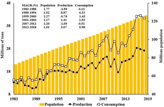 Temporal evolution of the Mexican population and its relationship with the production and consumption of maize from 1983 to 2018 (MAGR, Mean Annual Growth Rate).