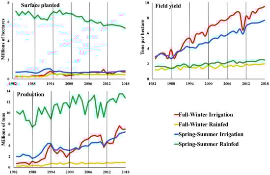 Temporal evolution of the surface planted, field yield, and grain maize production in Mexico from 1983 to 2018, per production cycle and water regime.