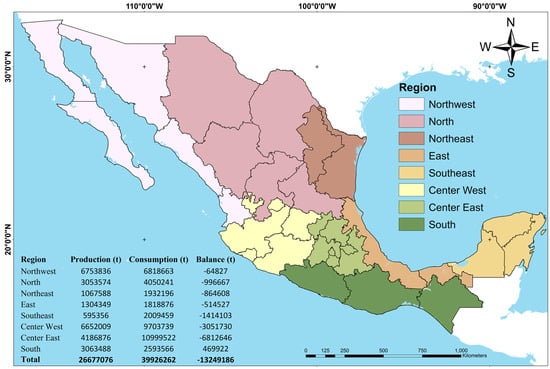 To determine the regions in Mexico with the highest deficits between production and consumption, the classification proposed by [20] was used, which divides the country into eight economic zones based on the existence of natural resources that allow certain productive activities and on the degree of development of the production forces. The Center East (6.81 million tons, which represents 51.65% of the national deficit), Center West (2.99 million tons, 22.68%) and Southeast (1.41 million tons, 10.72%) were the zones with the highest deficit of grain maize; in total, the three regions added up to 85.05% of national deficit (Figure 3).