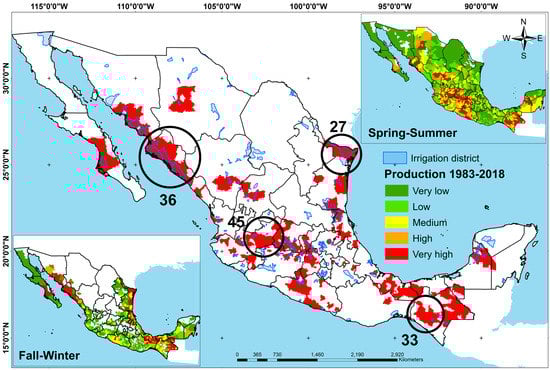 Data were obtained from the Agricultural and Fishing Information System [19] for grain maize production (t) of the municipalities that showed continuous operations from 1983 to 2018 in SS and FW. To determine the areas of highest productivity, the annual production per municipality for the period of analysis was added, and through tools of Geographic Information Systems, it was represented spatially. The results were grouped into five class intervals: very low, low, medium, high and very high production, both for SS and FW.