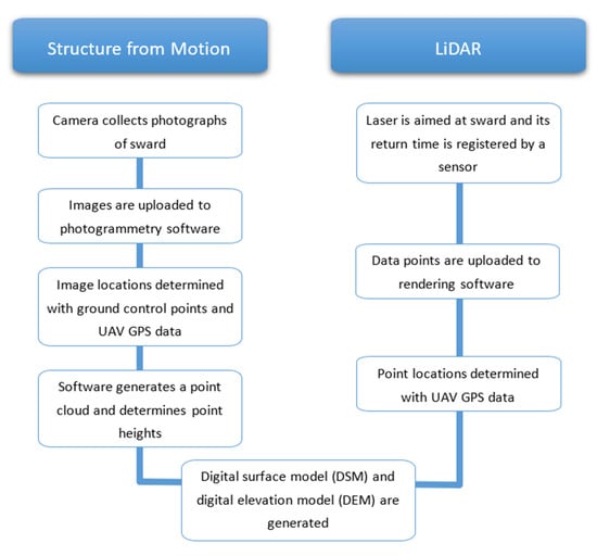 Photographic determinations of pasture height may be carried out with a simple red-green-blue (RGB) camera mounted onto a UAV or other vehicle [19] or held on a pole [20]. Ground control points (GCPs) are high-visibility objects used to provide a frame of reference for determining the position of the UAV in the pasture being photographed and are georeferenced using GPS after they are placed in the pasture [21]. The UAV is flown over the pasture, taking pictures rapidly at low altitude. The pictures are then loaded into a Structure from Motion (SfM) photogrammetry program which uses the GCP to reconstruct the path of the UAV and generate a point cloud, from which a digital surface model (DSM) and digital elevation model (DEM) are derived (Figure 1). By subtracting the height of the DEM from the DSM, canopy height may be calculated for a given point [21]. As with plate meters, these height data are then combined with hand-harvested biomass to derive a regression model to predict pasture biomass as a function of UAV-measured height [22]. Once the model has been developed and tested, the UAV’s height data may be used for determining biomass without the need for further hand-harvesting of biomass samples [21].