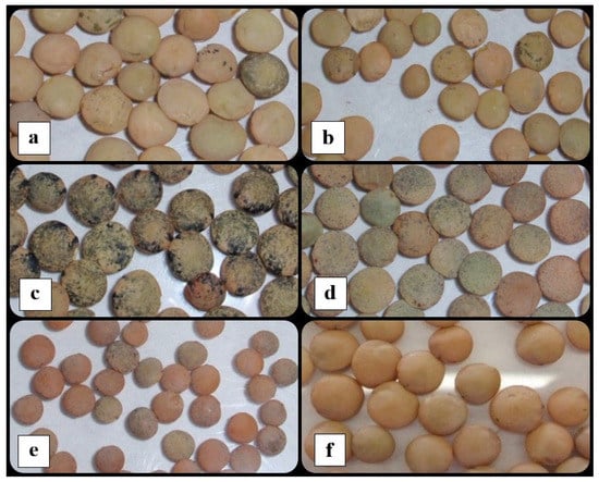 The lentil cultivars used in this work: (a) Guareña; (b) Rubia de la Armuña; (c) Jaspeada; (d) Microjaspeada; (e) Pardina; (f) Rubia Castellana.