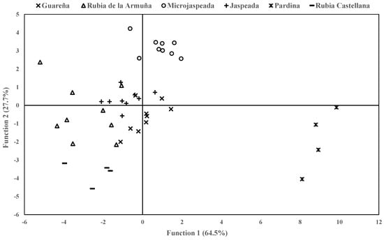 Scatter plot that shows the canonical or discriminant coordinates of the analyzed lentil samples. In brackets is the % variance that explains each of the canonical functions.