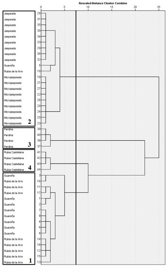 Clusters 3 and 4 were formed by the samples of the cultivars “Pardina” and “Rubia Castellana”, respectively, while clusters 1 and 2 were formed by a combination of samples of cultivars from the PGI “Lenteja de la Armuña”. The whole set of samples of the cultivars “Jaspeada” and “Microjaspeada” was found in cluster 2, together with one sample of cultivar “Rubia de la Armuña” and one sample of cultivar “Guareña”. Moreover, all the samples of the cultivar “Rubia de la Armuña”, were found in cluster 1, as well as all the samples of the cultivar “Guareña”, except for the abovementioned samples of each of these cultivars.
