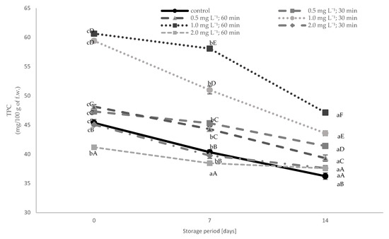 | 2 mg/L | 30 min | 9.02 a ± 0.25 | 25.44 bB ± 2.49 | 31.41 cBC ± 1.30 | 31.47 cB ± 1.38 | 33.91 cB ± 1.47 | |