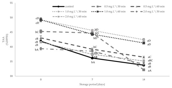 | 2 mg/L | 30 min | 8.48 a ± 0.25 | 16.61 bB ± 1.69 | 19.33 cB ± 0.70 | 18.97 bcB ± 0.90 | 19.84 cB ± 1.00 | |