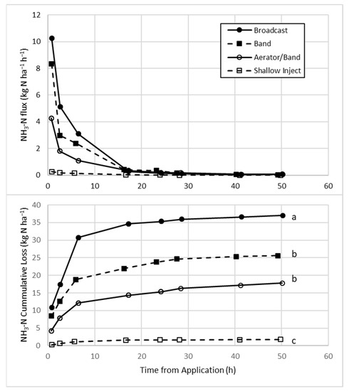 Mean NH3-N flux rates were similar in 2015 and 2016 with greater flux rates closer to the time of application (Figure 1), as previously demonstrated by other studies [7,11,12,27,33,45,46,47]. Broadcast application had substantially greater cumulative mean NH3 fluxes in the first 3 days after application compared to other treatments, followed by Band, Aerator/Band and Inject with flux reductions of 30%, 52%, and 95% of Broadcast, respectively. Band and Aerator/Band impacts on NH3 flux varied, decreasing NH3 flux by an average of 18 and 24% of Broadcast in 2015 (not statistically significant) and 43 and 77% of Broadcast in 2016 (significantly lower for Aerator/Band), respectively (data not shown).