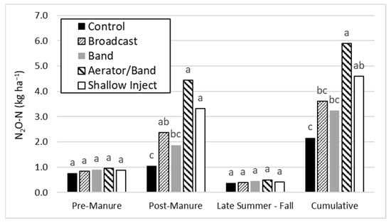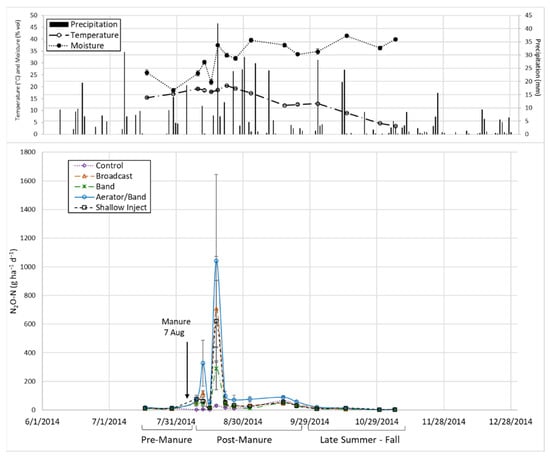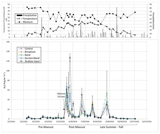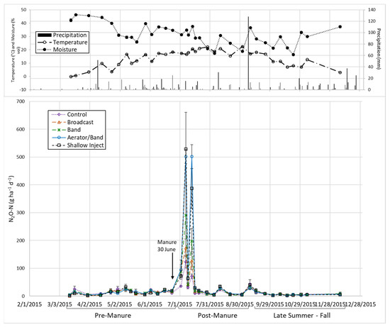 Previous studies in perennial forage systems have indicated that N2O fluxes tend to peak from one to two weeks after application, decreasing thereafter [26,27,28]. The amount of total N applied lost as N2O can be quite variable depending on site-specific conditions and weather. In a review of the factors affecting agroecosystem N2O fluxes, Bouwman [29] reported a range of 0–8% loss of applied N as N2O. Changes in soil moisture can have significant effects on N2O flux rates and cumulative losses [20,30,31]. With respect to manure application methods, research suggests that N2O fluxes tend to be greater with injection versus banding or broadcast due to greater N conservation from lower NH3 volatilization losses and the creation of favorable conditions for denitrification within injection slots.