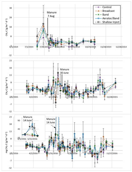 Mean methane (CH4) fluxes by manure application treatment for 2014 (top), 2015 (center), and 2016 (bottom).
