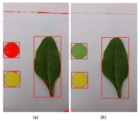 Objects detection. (a) All objects detected in the image (Figure 1b) using the bounding box algorithm, (b) the detected three regions of interests containing the reference color circles and the leaf using the proposed strategy.
