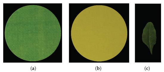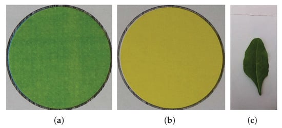 The background of the other circle () is removed analogously. However, since the leaf image may contain complex structures, e.g., veins and different colors, it is difficult to obtain an accurate segmentation using simple color-based thresholding. The background of the leaf image () is removed by using Gaussian Mixture Model (GMM). It divides the image into two clusters, and pixels are characterized in RGB space by their intensity [56,57]. Each pixel in the image is modeled into Gaussian distribution. The likelihood of a pixel in the image () at time t of each cluster is calculated.