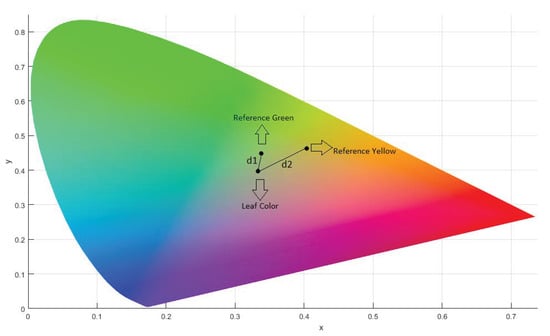 The mean color values of the reference yellow circle () and the leaf () are also calculated analogously. The green color value (GCV) index of the leaf is now computed by calculating the distance of the leaf mean color from the reference green and yellow colors. Let be the distance of the leaf from the green reference color and be the distance of the leaf from the yellow reference color computed using any color distance model. The GCV is then computed as the percentage of their ratio.