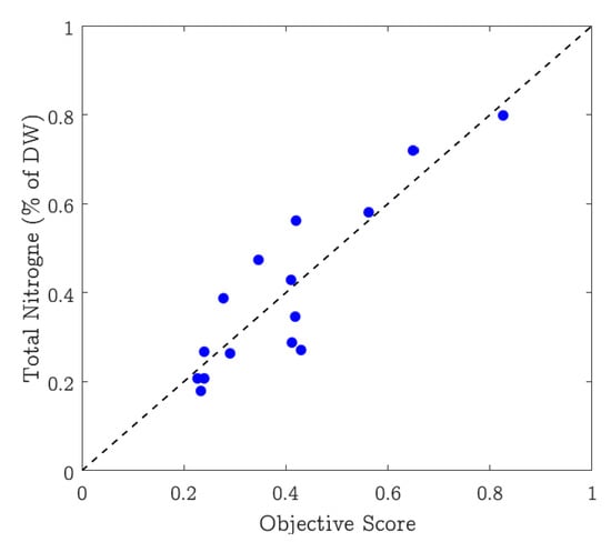 We evaluated the performance of the proposed algorithm and compared the results with various existing color-based n-nutrient estimation algorithms. For each test image, the leaf n-nutrient in terms of GCV is computed. For test leaves in the dataset, their nitrogen values were calculated in the laboratory by the KJeldahl method and are used as ground truth in this analysis. The objective scores computed by the proposed method were compared with the corresponding ground truth to estimate different correlations to assess its accuracy. We used the logistic function for non-linear mapping outlined in [67] of nitrogen values with the proposed system results and other compared methods before computing the performance parameters.