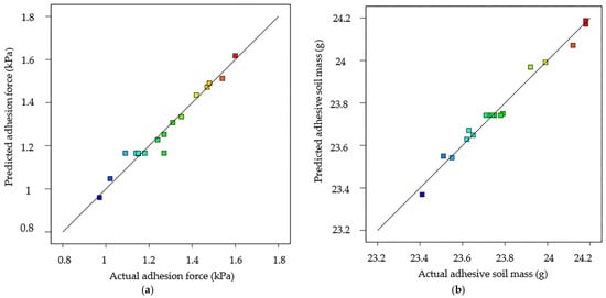 To ensure the adaptability and accuracy of the model, it was necessary to evaluate the predictive ability by analyzing the determination coefficient. The response model fit summary output for indicators is illustrated in Table 5. The coefficients of determination (R2) of the adhesion force and the adhesive soil mass were all larger than 0.95, suggesting that more than 95% of variations in the indices could be explained by the models. Moreover, both of the models’ difference between predicted R2 and adjusted R2 less than 0.2 indicates that the response surfaces of the two models established had good consistency and predictability for the experimental results [20]. The predicted vs. actual values for the response indicators are shown in Figure 3. It could be seen from the scatter plot that the actual values were basically distributed on the predicted curve, consistent with the trend of the predicted values, and linearly distributed. The predicted precision of the models was 15.72 and 23.61, which was far larger than four, suggesting the models were precise [35].