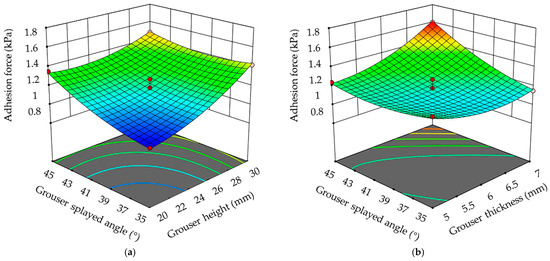 3D response surface diagram of pairwise interaction of the grouser height, grouser thickness, and grouser splayed angle on adhesion force. (a) Interaction of grouser height and grouser splayed angle; (b) interaction of grouser thickness and grouser splayed angle.