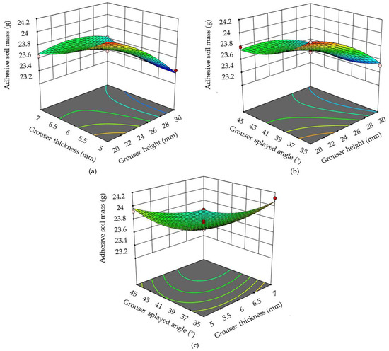 As was presented in Figure 5a–c, when one factor was fixed, another two factors were considered as interactive factors on adhesive soil mass. Figure 5a,b showed that the adhesive soil mass appeared to be a declining trend, which ranged from 24.18 g to 23.41 g, and Figure 5c showed that adhesive soil mass initially appeared as a declining trend and subsequently an increasing trend. Figure 5a showed that when the grouser splayed angle was maintained at 40°, the adhesive soil mass declined slowly with increases in the grouser height and the grouser thickness. The maximum adhesive soil mass was obtained when the grouser height was 20 mm and the grouser thickness was 5 mm. When the grouser height was 30 mm and the grouser thickness was 5 mm, the adhesive soil mass reached the minimum. The grouser thickness and the grouser height had an interactive effect on adhesive soil mass, and the effect of the grouser height on adhesive soil mass exceeded that of the grouser thickness. Figure 5b showed that when the grouser thickness was maintained at 6 mm, the adhesive soil mass declined with increases in the grouser height and the grouser splayed angle. The maximum adhesive soil mass was obtained when the grouser height was 20 mm and the grouser splayed angle was 35°. When the grouser height was 30 mm and the grouser splayed angle was 35°, the adhesive soil mass reached the minimum. The grouser height and the grouser splayed angle had an interactive effect on adhesive soil mass, and the effect of grouser height on adhesive soil mass exceeded that of the grouser splayed angle. Figure 5c showed that when the grouser height was maintained at 25 mm, the adhesive soil mass initially declined and subsequently increased with increases in the grouser height and the grouser splayed angle. The maximum adhesive soil mass was obtained when the grouser thickness was 7 mm and the grouser splayed angle was 35°. When the grouser thickness was 5 mm and the grouser splayed angle was 35°, the adhesive soil mass reached the minimum. The grouser thickness and the grouser splayed angle had an interactive effect on adhesive soil mass, and the effect of the grouser splayed angle on adhesive soil mass exceeded that of the grouser thickness. In a word, the interactive impact of combined factors on adhesive mass was ranked as .