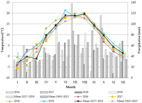 Air temperature and precipitation in the 2016–2019 growing seasons compared with the mean values (1965–2015); data provided by the Lublin-Radawiec meteorological station (Institute of Meteorology and Water Management—National Research Institute).