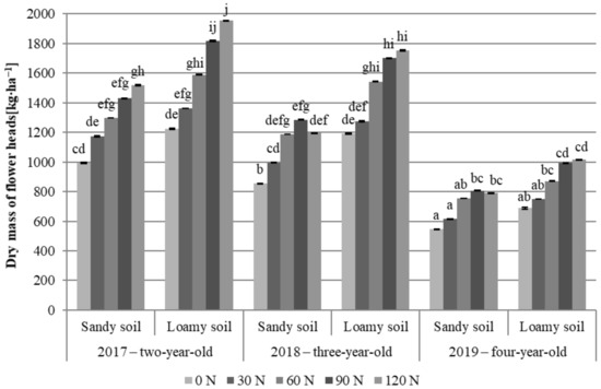 Yield of A. chamissonis flower heads depending on the experimental factors; 0 N, 30 N, 60 N, 90 N, 120 N—nitrogen doses (kg∙ha−1). Values designated by different letters are significantly different (p = 0.05) (Tukey test, p < 0.05).
