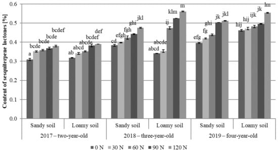 Content of sesquiterpene lactones in A. chamissonis flower heads depending on the experimental factors; 0 N, 30 N, 60 N, 90 N, 120 N—nitrogen doses (kg∙ha−1). Values designated by different letters are significantly different (p = 0.05) (Tukey test, p < 0.05).