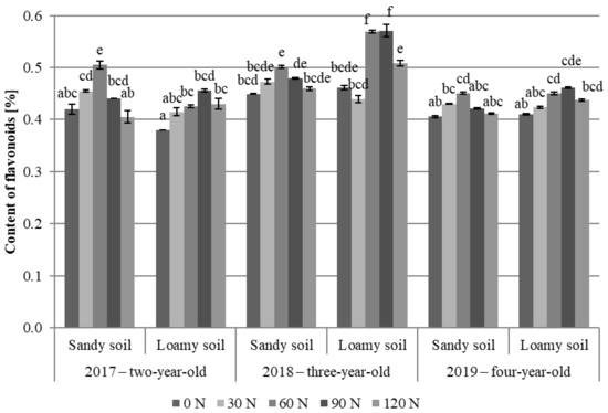 Content of flavonoids in A. chamissonis flower heads depending on the experimental factors; 0 N, 30 N, 60 N, 90 N, 120 N—nitrogen doses (kg∙ha−1). Values designated by different letters are significantly different (p = 0.05) (Tukey test, p < 0.05).