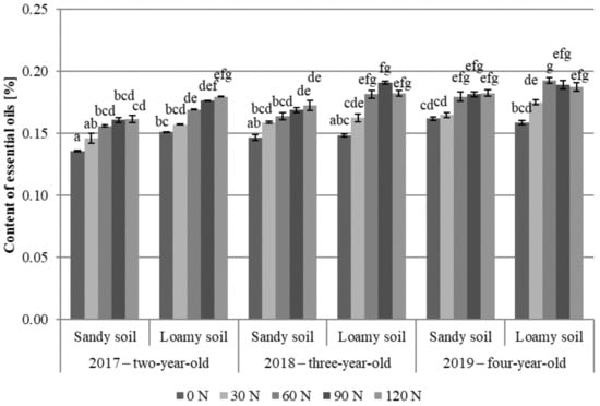 Content of essential oils in A. chamissonis flower heads depending on the experimental factors; 0 N, 30 N, 60 N, 90 N, 120 N—nitrogen doses (kg∙ha−1). Values designated by different letters are significantly different (p = 0.05) (Tukey test, p < 0.05).