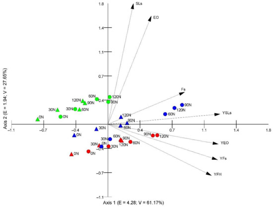 Principal component analysis (PCA) ordination diagram presenting the distribution of the samples based on mean values of the studied characteristics under the influence of nitrogen fertilization; E—eigenvalues, V—percentage variance explained by the first two PCA axes, SLs—sesquiterpene lactones, Fs—flavonoids, EO—essential oils, YSLs—yield of sesquiterpene lactones, YFs—yield of flavonoids, YEO—yield of essential oils, YFH—yield of flower heads, 0 N–120 N—nitrogen doses, circle—loamy soil, triangle—sandy soil, red color—2017, blue color—2018, green color—2019.