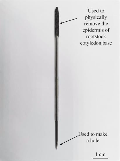 The new grafting tool was developed by Huazhong Agricultural University. We already applied for the patent (Application Number: 202110518435.5, China National Intellectual Property Administration). Briefly, one end is composed of a conical file sticking with emery grain, which is convenient to physically remove the epidermis of the rootstock cotyledon base (Figure 1). Another end is the grafting needle, where the purpose is to make a hole in the hole insertion grafting method (Figure 1).