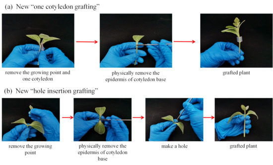 However, splice grafting often results in a low graft survival rate and poor seeding quality [15,16]. In addition, labor is required for the chemical application, and damage to seedlings can occur [15,16,17,18,19]. Thus, the goal of this study was to establish an alternative approach to control rootstock regrowth. Here, we developed a new grafting method, i.e., the epidermis of rootstock cotyledon base was physically removed by a new tool during grafting. To evaluate the efficiency of this method, rootstock regrowth rate, scion growth, and working time were documented and compared with traditional methods. Compared to traditional methods, significantly lower rootstock regrowth rate and enhanced scion growth were observed in the new method of grafted plants. Meanwhile, this new method was labor-saving since the time used to physically remove the epidermis of rootstock cotyledon base was significantly shorter than the time required by the traditional grafting methods.