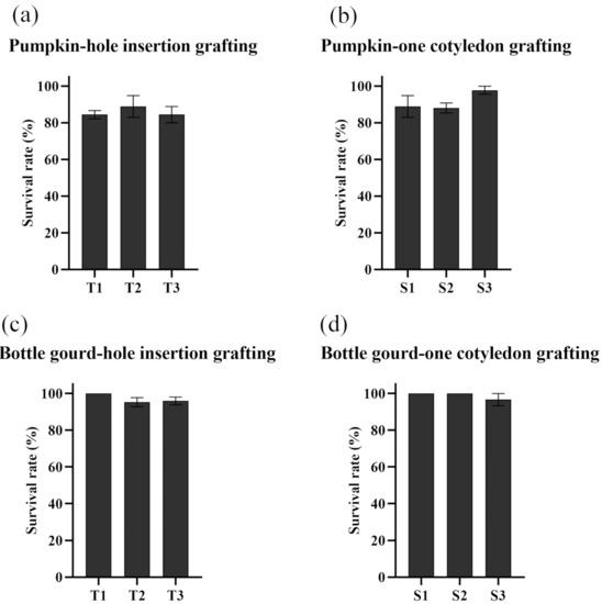 Graft survival rate at day 14 after grafting (n = 3). T1 and S1, new “hole insertion grafting” (a,c) and “one cotyledon grafting” (b,d), respectively, without the regrown rootstock removal; T2 and S2, traditional “hole insertion grafting” (a,c) and “one cotyledon grafting” (b,d), respectively, with manual regrown rootstock removal 3 times; T3 and S3, traditional “hole insertion grafting” (a,c) and “one cotyledon grafting” (b,d), respectively, without the regrown rootstock removal.