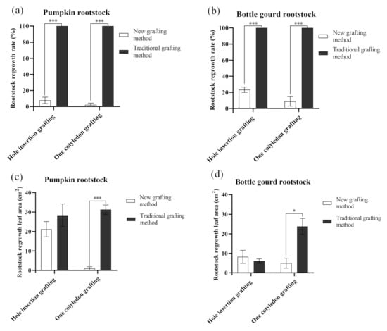 Rootstock regrowth rate (a,b) and regrown rootstock leaf area (c,d) at day 14 after grafting (n = 3). The rootstock regrowth was not removed for the new or the traditional grafting methods. For the measurement of regrown rootstock leaf area, only the regrown rootstock plants were investigated and calculated. * and *** indicate significant differences at p< 0.05 and 0.001 levels, respectively.