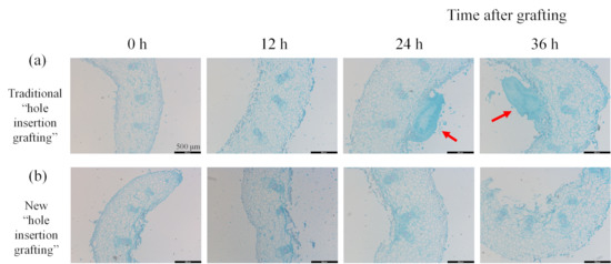 Compared with traditional grafting, few regrown rootstocks were seen in the plants using the new method (Figure 4a–d). The rootstock regrowth rate was decreased from 100% to 8% in pumpkin hole insertion using the new method as compared with traditional methods, and the value was decreased from 100% to 2% in one cotyledon grafting (Figure 5a). For bottle gourd rootstock, the rootstock regrowth rate was decreased from 100% to 23% using hole insertion and from 100% to 9% using one cotyledon grafting (Figure 5b). Anatomical observation of the pumpkin rootstock cotyledon base also showed that the new method inhibited the rootstock regrowth at earlier stages (24 and 36 h) after grafting (Figure 6a,b). Among the few regrown rootstock plants using the new method, the regrown leaf area was significantly smaller than the traditional one cotyledon grafting method, and no significant difference was observed on the hole insertion grafting (Figure 5c,d).