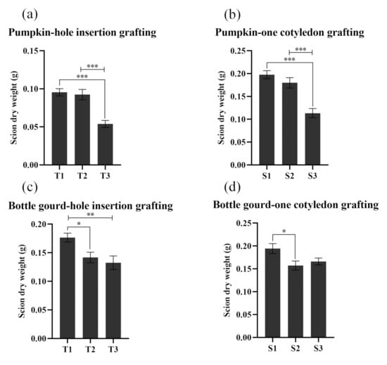 Compared with pumpkin traditional grafting without rootstock regrowth removal, the new grafting method significantly increased scion dry weights by 78% and 75% for hole insertion and one cotyledon grafting, respectively (Figure 7a,b). In the traditional hole insertion and one cotyledon grafting methods, removal of pumpkin regrown rootstock significantly increased scion dry weight compared with the traditional method without removal of regrown rootstock (Figure 7a,b). For bottle gourd rootstock, the new grafting method significantly increased scion dry weights by 25% and 24% for hole insertion and one cotyledon grafting, respectively, as compared with traditional grafting with regrown rootstock removal (Figure 7c,d).