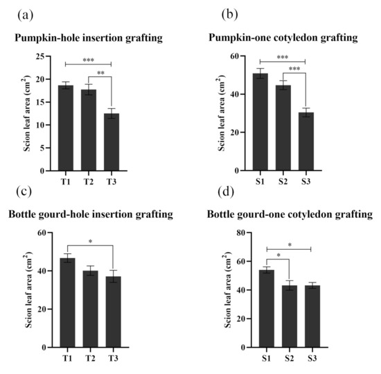 Watermelon scion leaf area at day 14 after grafting (n = 3). T1 and S1, new “hole insertion grafting” (a,c) and “one cotyledon grafting” (b,d), respectively, without regrown rootstock removal; T2 and S2, traditional “hole insertion grafting” (a,c) and “one cotyledon grafting” (b,d), respectively, with manual regrown rootstock removal 3 times; T3 and S3, traditional “hole insertion grafting” (a,c) and “one cotyledon grafting” (b,d), respectively, without regrown rootstock removal. *, **, and *** indicate significant differences at p < 0.05, 0.01, and 0.001 levels.