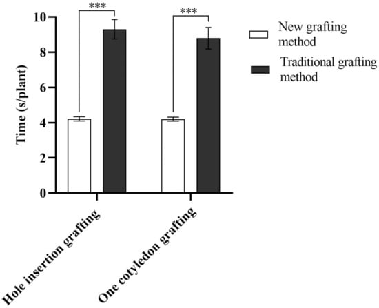 Time used to physically remove the pumpkin rootstock cotyledon epidermis for the new grafting method and the time required to remove rootstock regrowth for the traditional grafting method (n = 3). *** indicates significant difference at p < 0.001 level.