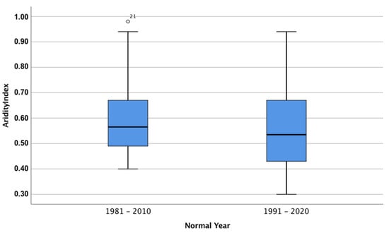 Since the climate normal of 1951/1980 the precipitation has declined approximately 24% and the ET0 has increased 6% in the studied area (Table 1, Table 2 and Table 3). One sample T-tests reveal that the decrease in precipitation and the increase in ET0 were statistically significant between the climate normal 1951/1980 and 1981/2010 (p < 0.01) and between the climate normal 1981/2010 and 1991/2020 (p < 0.01) but it was not significantly different (p > 0.05) when comparing the climate normals 1981/2010 and 1991/2020 (Table 4), probably because of the slow variability of the parameters in such short time span, although a boxplot comparison with a confidence interval of 95% reveals that, indeed, the aridity index average is ever becoming closer to the 0.50 mark (Figure 2), having decreased from an average of 0.78 in 1951/1980 to 0.56 in 1991/2020 (Table 4) with polarized values as high as 0.98 and as low as 0.30.