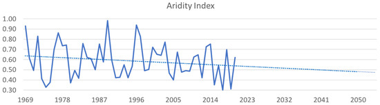 Aridity index in the study area and linear projection for the year 2050.