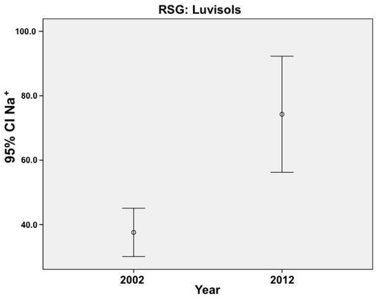 Considering the available Na+ in the irrigated soils of the study area we registered a significant increase (p < 0.05) from 2002 to 2012 of 7% (Table 5a). A more in-depth analysis reveals that this increase isn’t related with a particular RSG (Table 5b) as the available Na+ levels do not undergo statistically significant changes (p > 0.05). Therefore, the mid-term increase in available Na+ in irrigated soils is generalized, and not specific to a particular RSG, and was significantly correlated with soils that present good natural drainage (p < 0.05), useful depth > 0.100 m (p < 0.01), medium to heavy texture (p < 0.01) and crop (p < 0.01). The three crops causing the greatest accumulation of available sodium in the studied area are corn (15% increase), cereals (36% increase) and olive (34% increase), all for a p < 0.05 (*), with these increases occurring mainly in the Fluvisols and Luvisols RSG. The great CEC of the Luvisols (as presented in Telo da Gama et al. [5]) where corn crop was grown, and the general increase in ET0, provided that the sodium content augmented by 98% during the period of this study in the aforementioned RSG as the error bar (Figure 4) and predictive map analysis (Figure 5) confirm.