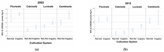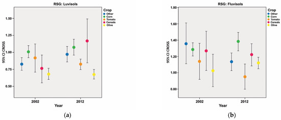 Other comparisons revealed that CROSS variations were correlated to crop, physiographic position, useful depth, texture, ET0 and RSG (p < 0.01) (*). The CROSS increases in the Luvisols RSG where crops such as cereals and corn are grown and remained constant where tomato and olive (Figure 8a) are present. In the Fluvisols RSG only the soils where corn crops are grown had a significant increase in CROSS with other crops such as grains and olive maintaining the CROSS averages constant. In the soils where crops like tomato are present, the CROSS mean values have diminished from 2002 to 2012 (Figure 8b).