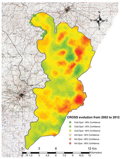 Predictive + Hotspot map of CROSS evolution in the studied area from 2002 to 2012.