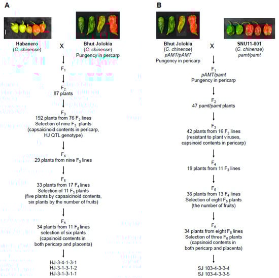 Three C. chinense accessions, ‘SNU11–001’, ‘HB’, and ‘BJ’, were used to construct two populations, ‘HJ’ (‘HB’ × ‘BJ’) and ‘SJ’ (‘SNU11–001’ × ‘BJ’) (Figure 1). Nine ‘HJ’ F3 plants were selected, which have the highest capsaicinoid contents in pericarp and ‘Jolokia’—type genotypes for three QTLs among 192 F3 individuals (Table S1) [19]. Twenty-nine ‘HJ’ F4 individuals from nine F3 lines were grown, and 17 plants were selected. Thirty–three ‘HJ’ F5 individuals were grown, and 11 plants were selected by capsaicinoid contents of fruits and yield (Table S2). Thirty–four F6 individuals from 11 F5 plants were grown and capsaicinoid contents were measured to select six plants (Table S3). Six to eight replicates of six F7 lines were evaluated by capsaicinoid contents and three ‘HJ’ lines were selected (Figure S1).