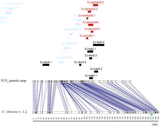 ‘SJ’ F2 linkage map of chromosome 6 containing QTLs related to the capsaicinoid and capsinoid contents in the pericarp. Red and black bars indicate QTLs for capsinoids and capsaicinoids, respectively. Blue lines indicate overlapping bin markers on the genetic map and C. chinense scaffold v. 1.2. The two green triangles below the physical map indicate the region of SNP markers based on the QTLs for capsaicinoids.