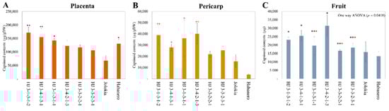 Capsaicinoid contents of the placenta (A), pericarp (B), and fruit (C) in the ‘HJ’ F7 lines. Bars represent standard error (n = 3). Black and red asterisks indicate a statistical difference from ‘BJ’ and ‘HB’ respectively, as revealed using a one–way ANOVA and Fisher LSD, with p–values between 0.001 and 0.01 showed with ‘**’, and lower than 0.05, ‘*’.