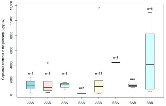 To explore whether the pericarp capsinoid contents were higher in plants with more ‘BJ’ alleles in the capsinoid QTLs, the capsinoid contents of these plants were evaluated and analyzed using an ANOVA (Figure 4). We identified a significant difference (p–value 0.0283) between plants with different combinations of ‘BJ’ alleles demonstrating a positive correlation between the number of ‘BJ’ alleles and the pericarp capsinoid content.