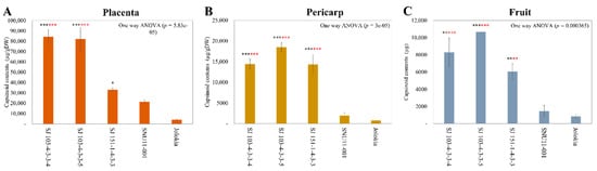 Capsinoid contents of the placenta (A), pericarp (B), and fruit (C) in the ‘SJ’ F7 lines. Bars represent standard error (n = 3). Black and red asterisks indicate a statistical difference from ‘BJ’ and ‘SNU11–001’ respectively, as revealed using a one–way ANOVA and Fisher LSD, with p–values between 0 and 0.001 shown with ‘***’, lower than 0.01, ‘**’ and lower than 0.05, ‘*’.
