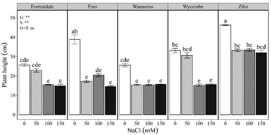 In Experiment 2, the seedling emergence date did not significantly differ between treatments as the salt stress was applied at 21 DAS, after seedling emergence. In Experiment 1, the salinity treatments reduced plant height in Freo, Wycombe, and Zibo, relative to the control. Similarly, Wang et al. [29] suggested that decreased shoot height in maize induced by salt stress was associated with the impaired cell wall extensibility [42]. Jiao et al. [43] reported that 100 mM NaCl significantly reduced plant height in castor bean genotype ZiBi 5.