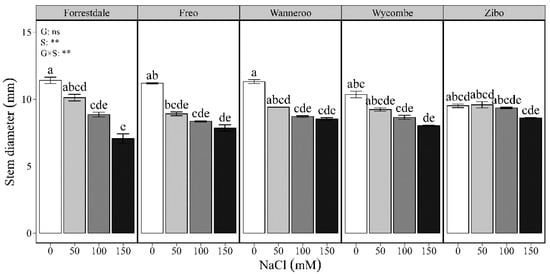 Salinity treatment significantly affected stem diameter of castor bean, with a significant genotype × salinity interaction (Figure 2). In general, stem diameter decreased with increasing salinity levels (Figure 2). For Forrestdale, Freo, and Wanneroo, the 100 mM and 150 mM NaCl treatments significantly decreased stem diameter, relative to the control, but not the 50 mM NaCl treatment. For Wycombe, the 150 mM NaCl treatment decreased stem diameter, relative to the control, but not the 50 and 100 mM NaCl treatments. For Zibo, stem diameter did not differ between the salinity treatments and the control.