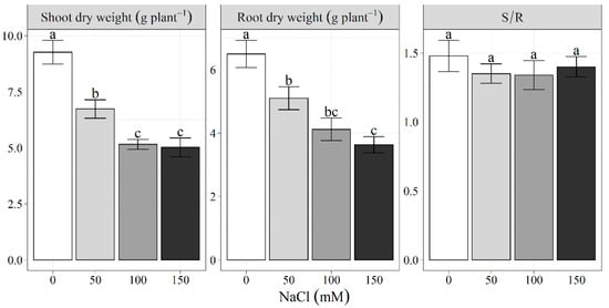 (Experiment 1) Shoot and root dry weights and their ratio (S/R) at 91 days after sowing of castor bean subjected to different salinity levels. Data are means of three replicates ± standard errors. Within each trait, bars followed by different letters differ significantly at p < 0.05.