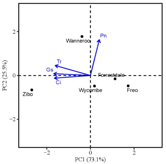 Salinity treatment significantly affected net photosynthetic rate, transpiration rate, stomatal conductance, and intercellular CO2 concentration (Table 1). Genotype had a significant effect on all photosynthetic traits. There was no significant genotype × salinity interaction for any photosynthetic traits. Averaged across genotypes, the 100 mM and 150 mM NaCl treatments decreased net photosynthetic rate by 35.4% and 58.5%, respectively, relative to the control (Table 1). Transpiration rate decreased with increasing salinity levels. Stomatal conductance and intercellular CO2 concentration decreased with increasing salinity levels until 100 mM NaCl. Averaged across salinity treatments, Zibo had a relatively higher transpiration rate, stomatal conductance, and intercellular CO2 concentration than Freo, but a similar net photosynthetic rate. Similarly, the principal component analysis showed that the first two principal components accounted for 98.6% of the total variance in the dataset and effectively discriminated Zibo for higher Tr, Gs, and Ci values, in contrast with Wycombe, Forrestdale, and Freo. In contrast, Wanneroo is characterized by higher Pn values (Figure 4).