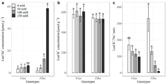 Leaf Na+ concentration in Zibo increased with increasing salinity levels (Figure 5a). For Freo, there were no significant differences between salinity treatments and the control for leaf Na+ concentrations. In the 100 mM and 150 mM NaCl treatments, Zibo had 1.5-fold and 7.9-fold higher leaf Na+ concentration than Freo, respectively, indicating that Freo was able to reduce Na+ concentration in leaf tissue compared to Zibo, thus showing a higher K+/Na+ ratio under salinity stress (Figure 5). For Freo and Zibo, leaf K+ concentrations did not significantly differ between salinity treatments and the control (Figure 5b). Salinity treatments decreased the leaf K+/Na+ ratio in Zibo, relative to the control (Figure 5c), but had no effect on the leaf K+/Na+ ratio of Freo.