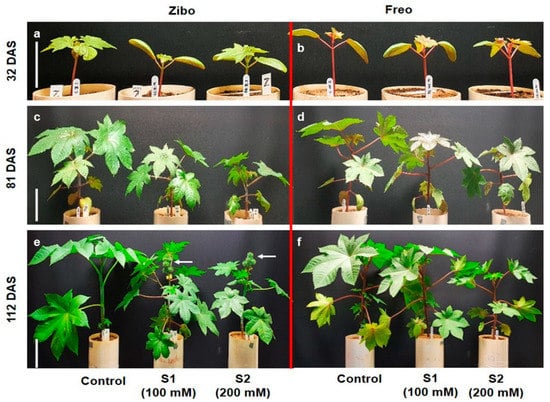 (Experiment 2) Shoot growth of castor bean genotypes Zibo (a,c,e) and Freo (b,d,f) under three salinity treatments (control, 0 mM NaCl; S1, 100 mM NaCl; and S2, 200 mM NaCl) at 32 (a,b), 81 (c,d) and 112 (e,f) days after sowing (DAS). White bars = 10 cm. Arrows in (e) indicate flowering and pod development in Zibo plants in the two salt treatments at 112 DAS.